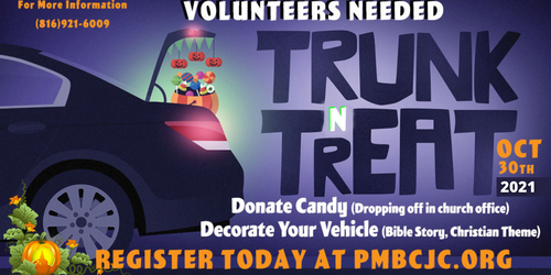 Thank you so much for volunteering to decorate your trunk. If you have any questions, please contact us by email at info@pmbcjc.org or calling the church office (816)921-6009.